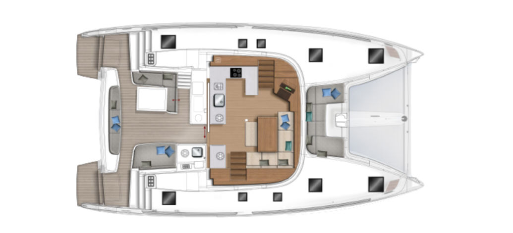 Large salon and cockpit spaces, spacious front area with sunbathing spots, and an independent skipper’s station on the flybridge provide you with many options and privacy during the journey.
